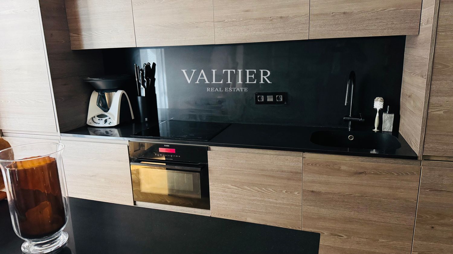 Cocina moderna integrada, completamente equipada con electrodomésticos panelados.