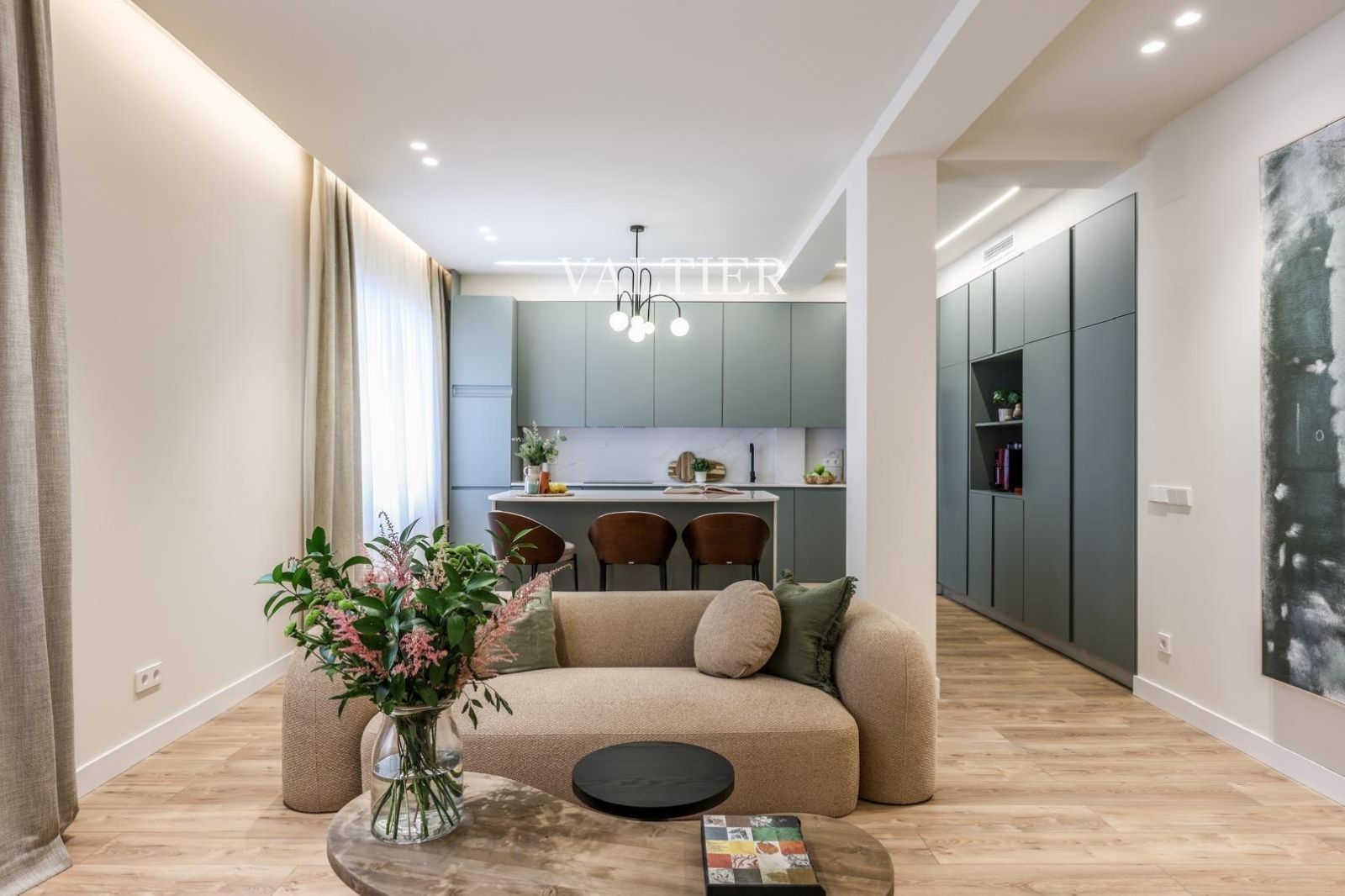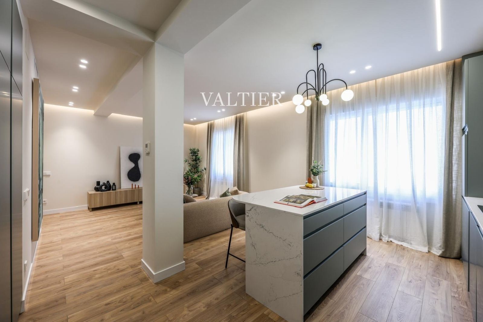 La zona de día se organiza en torno a un salón-comedor amplio y luminoso, donde la altura de techos aporta una mayor sensación de volumen y sofisticación. La cocina, completamente equipada, se integra de forma natural en el conjunto, ofreciendo practicidad y diseño.