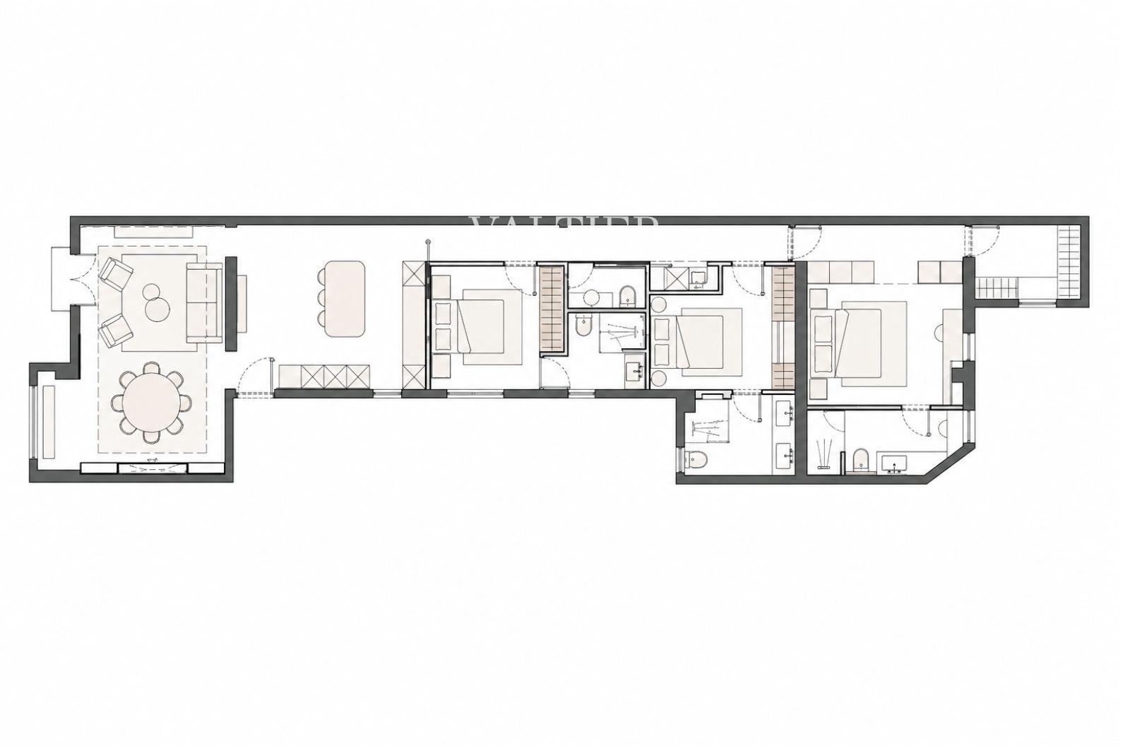 La zona de descanso ofrece tres dormitorios y cuatro baños completos, proporcionando una distribución muy demandada que garantiza confort y privacidad. Cada estancia ha sido diseñada con materiales de primera calidad y una estética elegante y actual.